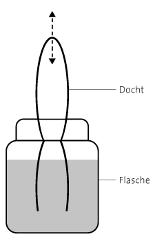 Drehverschluss öffnen. Docht oberhalb der Plastikkappe zur Verdunstung des Öls aufrichten. Über die Höhe des aufgestellten Dochtes kann die Menge des zu verdunstenden ätherischen Öls reguliert und an die Größe des Raumes angepasst werden.